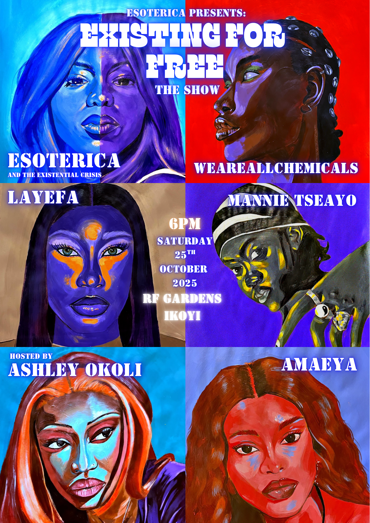 Multi-hyphenated doesn’t begin to describe Esoterica. A fresh voice in Nigeria’s music scene, her wide range of influences, tied together by soulful lyricism, allows her to craft beautifully written songs across genres, from rock to R&B. Her emotionally resonant writing has drawn in both producers and audiences, building a diverse fanbase. In her live shows, she brings her energy to the stage with her band for an electric performance, energising even newcomers to her sound despite sitting on a bank of unreleased music. Oh, and she’s also a gifted painter, responsible for the portraits of all the featured artists. Her creative direction is singular and focused.
